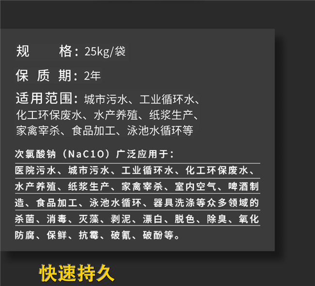 本產(chǎn)品還可用于工業(yè)漂白,高級(jí)洗衣粉,洗滌劑,去污粉等添加劑。而且還可做羊毛紡縮處理劑,皮毛加工的滅菌漂制等行業(yè)。另外它能有效的抑制細(xì)菌的繁殖和臭味的發(fā)生,很適合作家庭,公共場(chǎng)所,垃圾污物、便具,陰坑,水溝的消毒去臭劑。